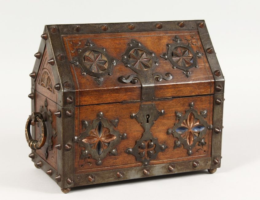 A SMALL GOTHIC REVIVAL METAL BOUND CASKET, 20TH CENTURY, with velvet lined interior.