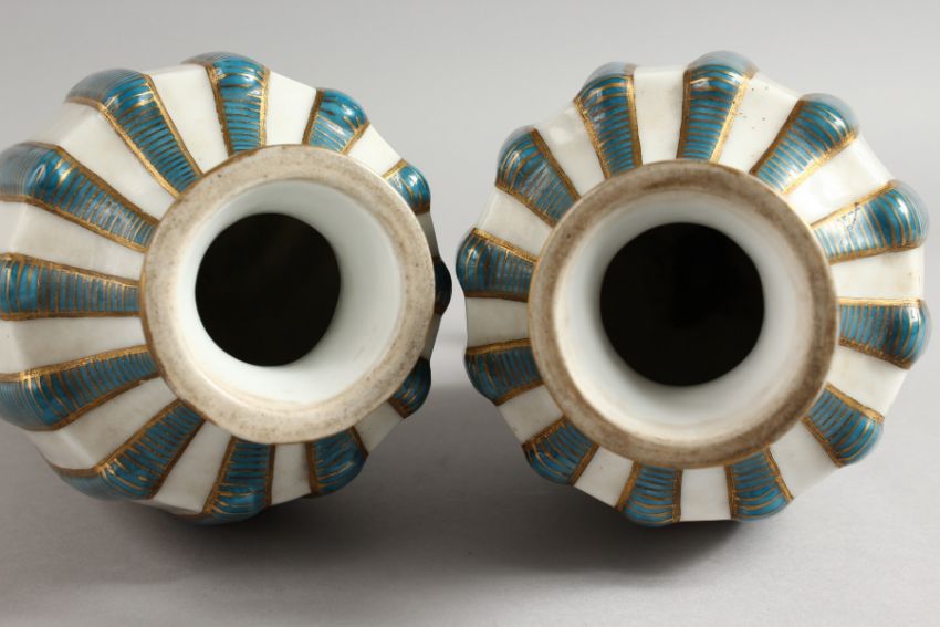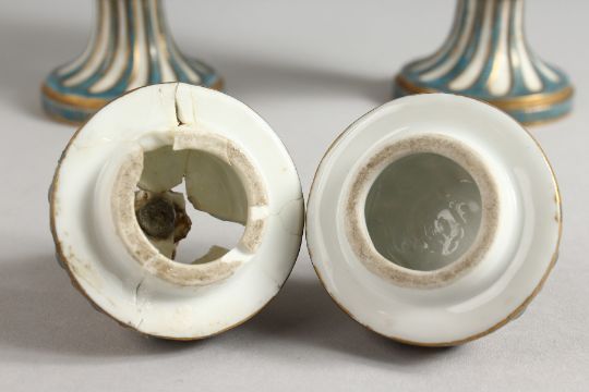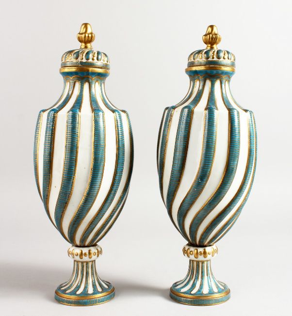 A SEVRES STYLE 19TH CENTURY PORCELAIN PAIR OF VASES AND COVERS, 3rd quarter of 19th Century, each of spiral moulded shape, painted in turquoise and white heightened in gilt, interlaced 'L's' in blue enamel to the the bases.