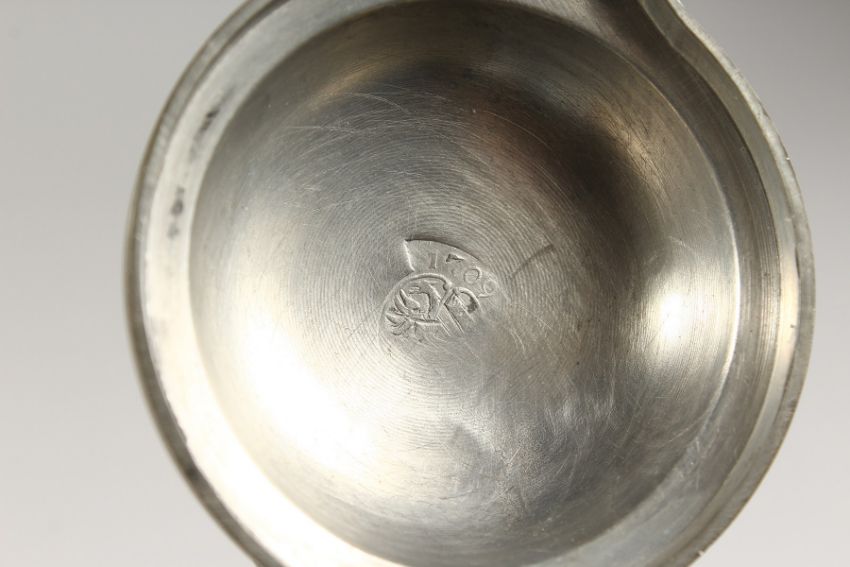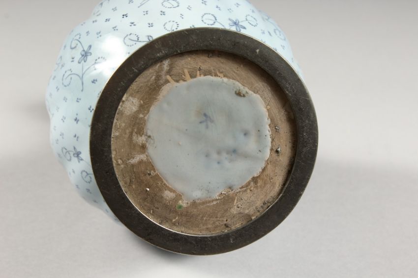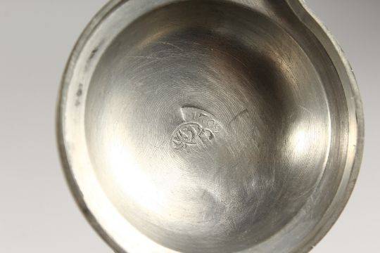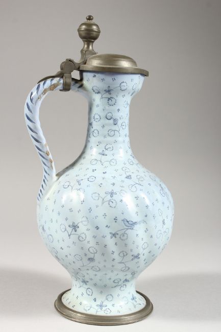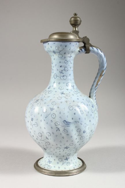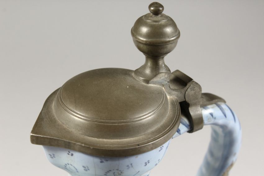 A CONTINENTAL TIN-GLAZED JUG, with hinged pewter cover and base.