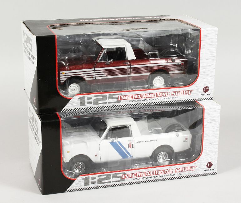 SET OF TWO FIRST GEAR 1.25 SCALE INTERNATIONAL SCOUT PICK UP TRUCKS.