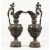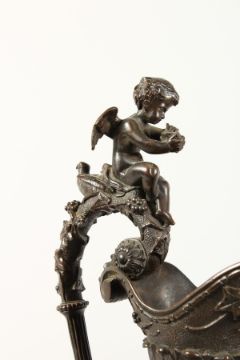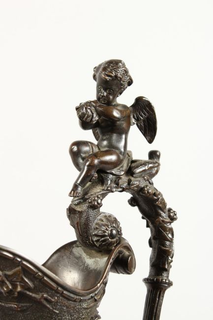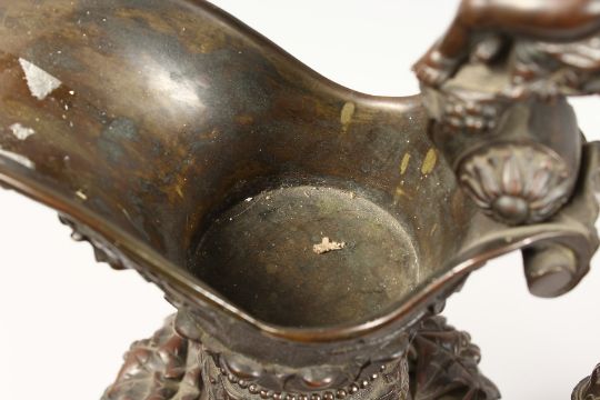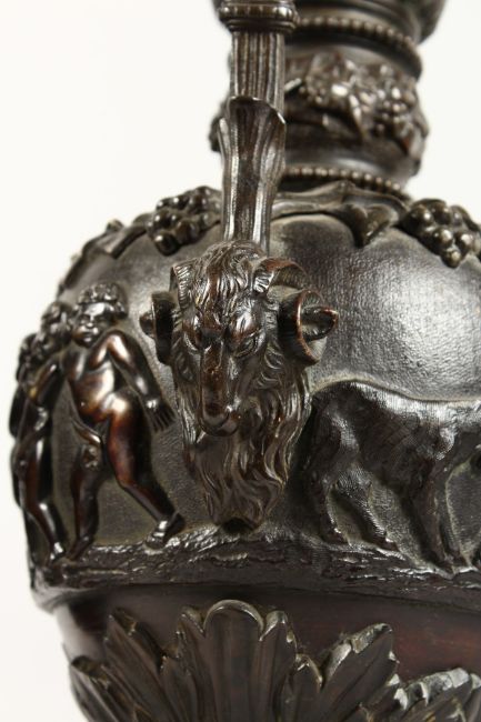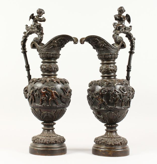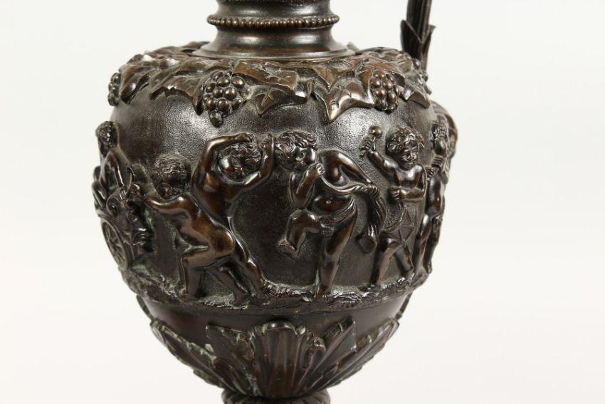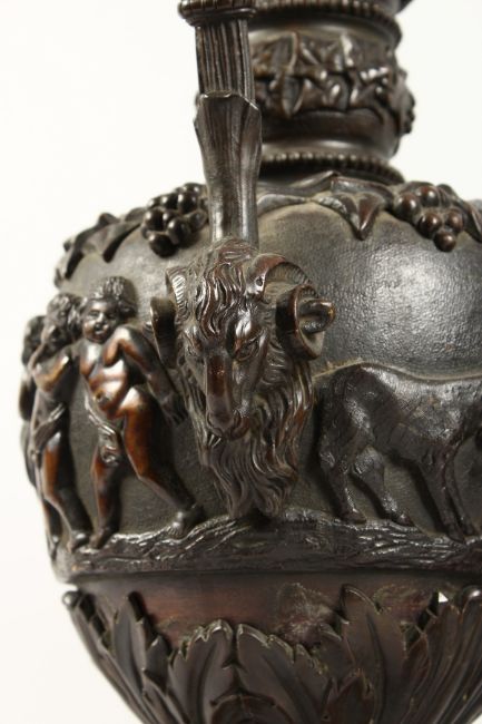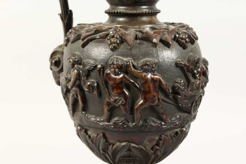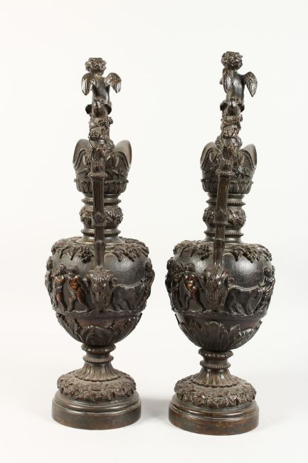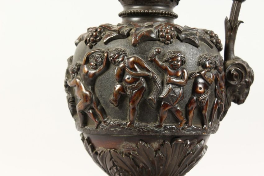 A SUPERB PAIR OF LARGE BRONZE ITALIAN CLASSICAL EWERS, with a band of cupids, rams masks and fruiting vines.