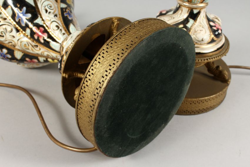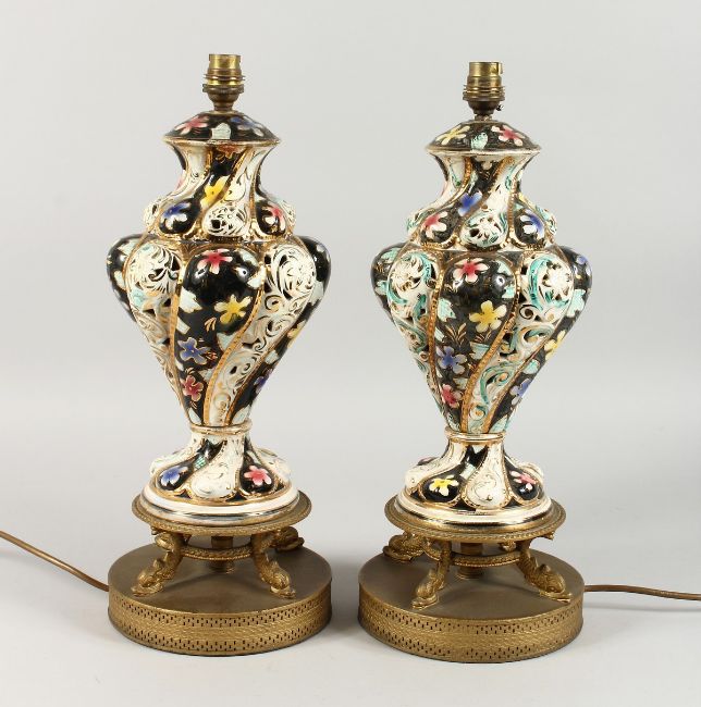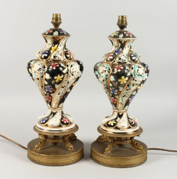 A GOOD PAIR OF ZSOLNAY PIERCED PORCELAIN VASES, on gilt stands converted to lamps.