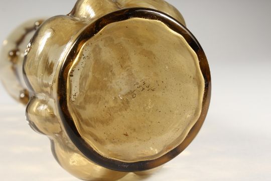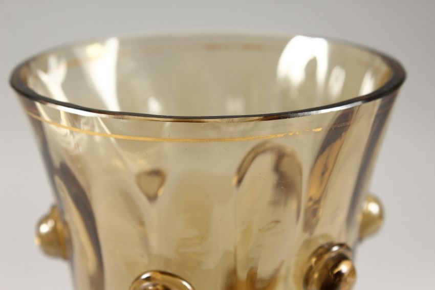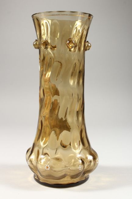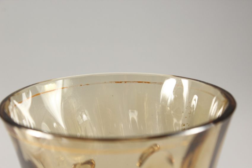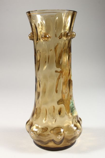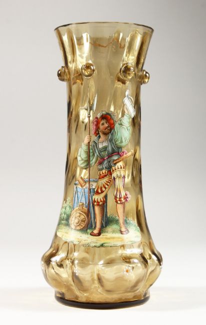 AN ITALIAN AMBER TINTED MOULDED GLASS VASE, enamel decorated with a classical figure.