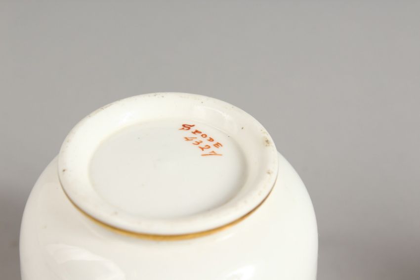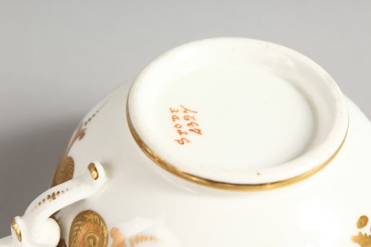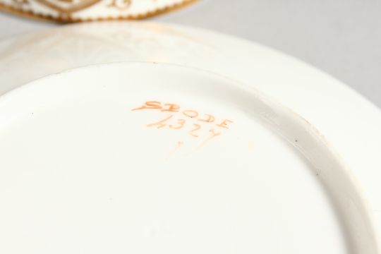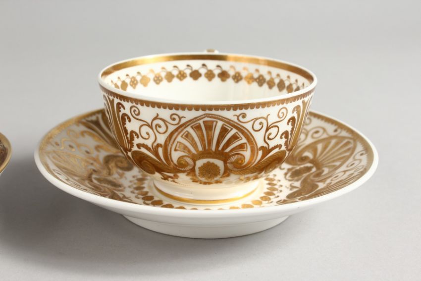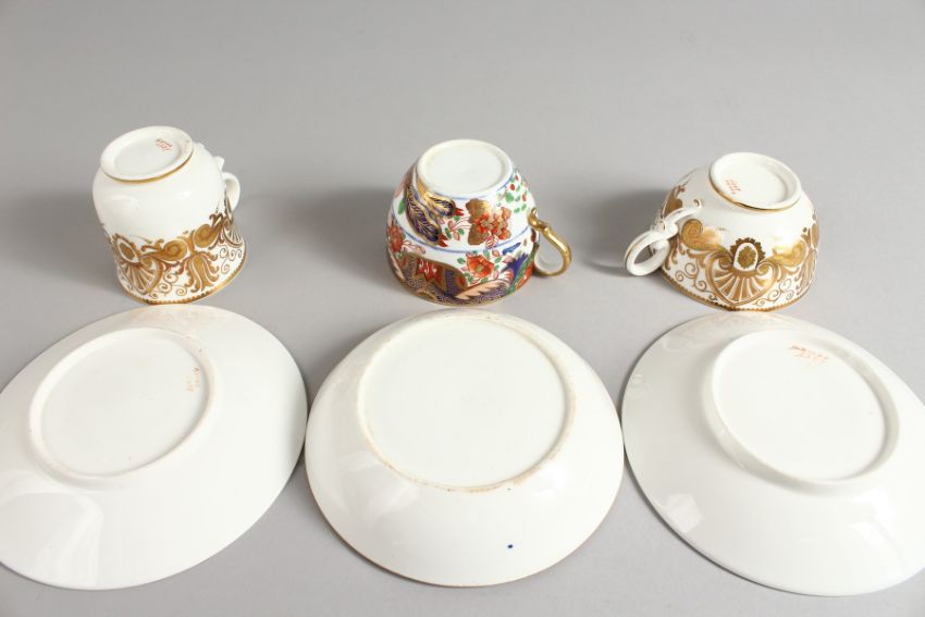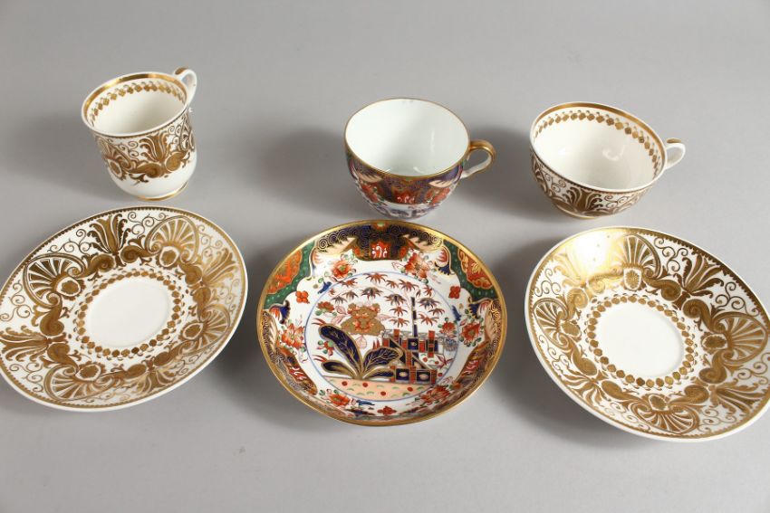 A SPODE COFFEE CUP AND SAUCER AND A TEACUP AND SAUCER superbly decorated in raised gold in Empire style pattern 4327 and a Spode Imari pattern teacup and saucer, early 19th Century.