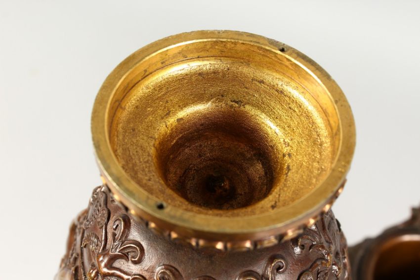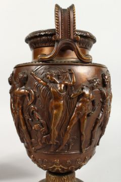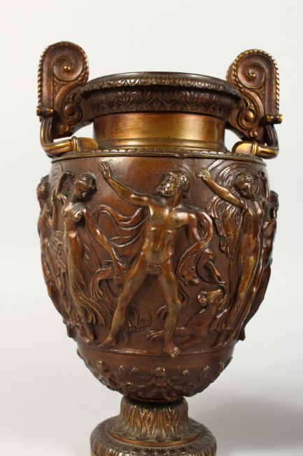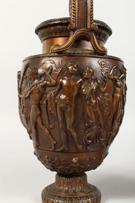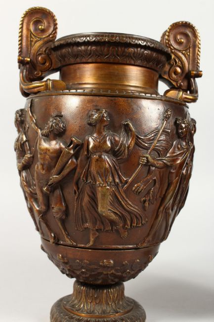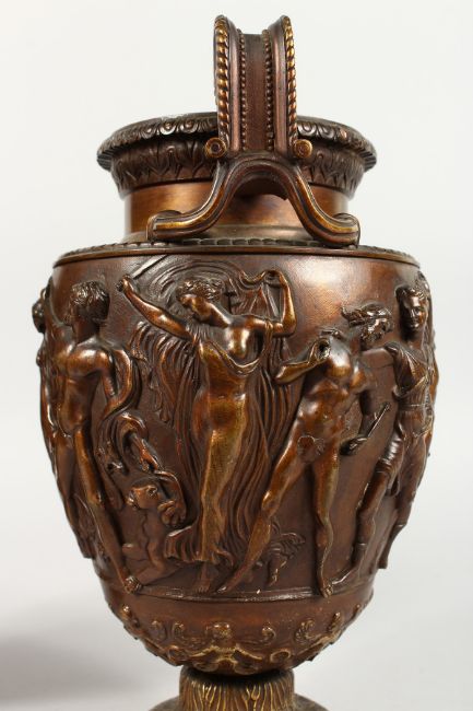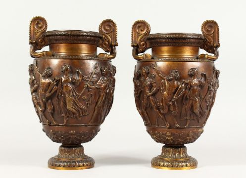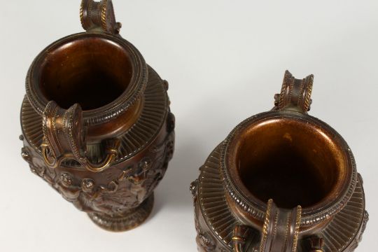 A PAIR OF SUPERB QUALITY 19TH CENTURY BRONZE RENAISSANCE DESIGN TWO-HANDLED URNS, the sides with Roman figures in relief.