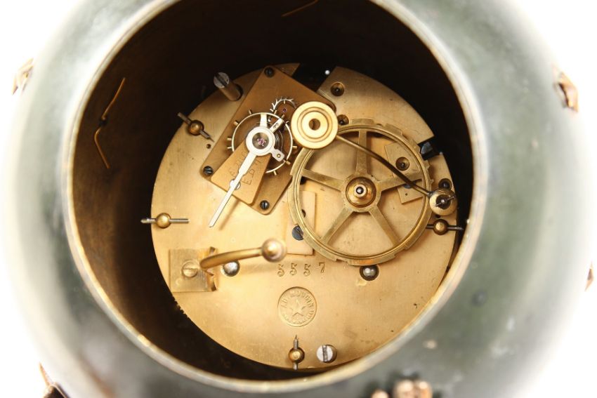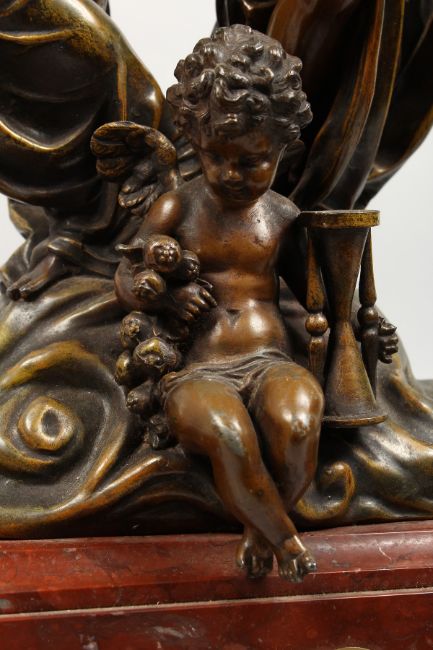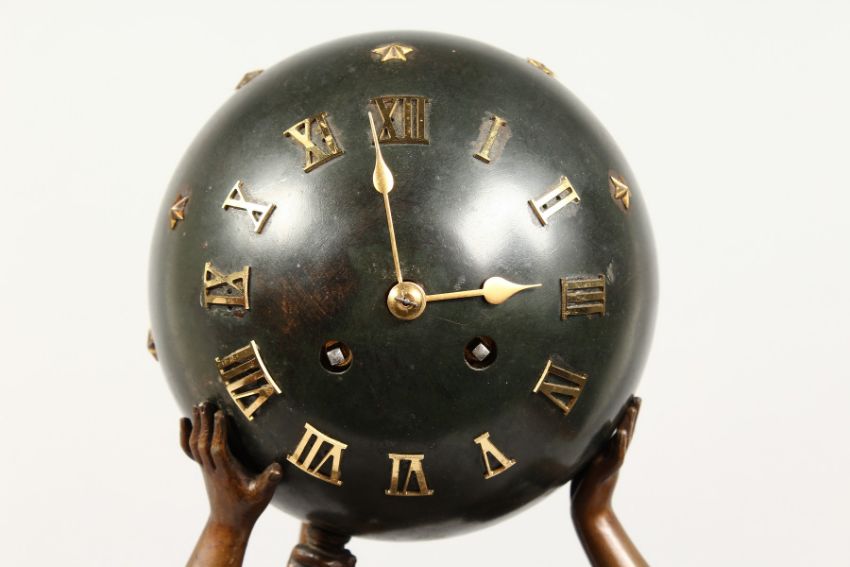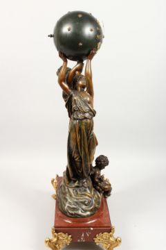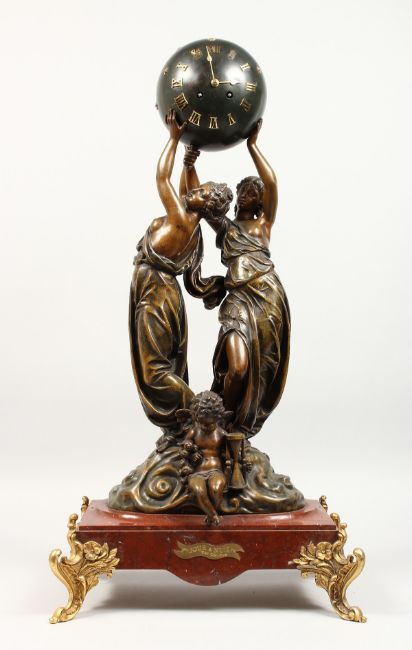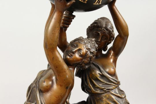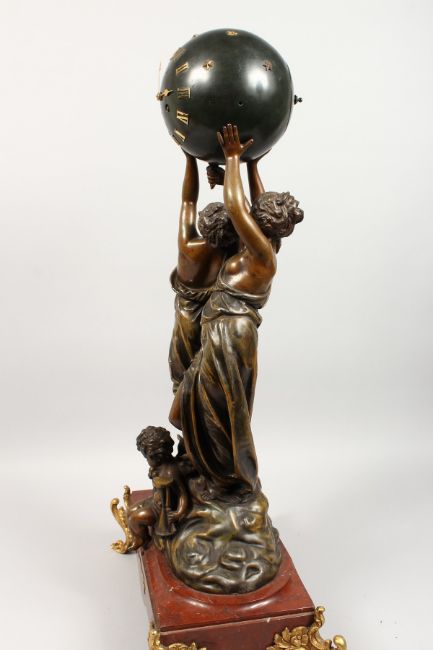 A GOOD LARGE BRONZE CLOCK "JOUR & NUIT", with two full-length maidens holding a globe of the world which is the clock, on a marble base.