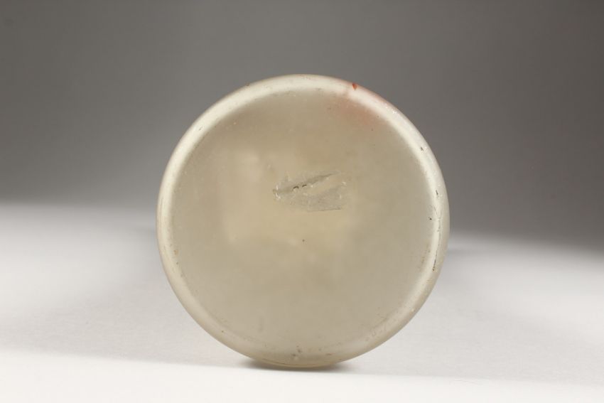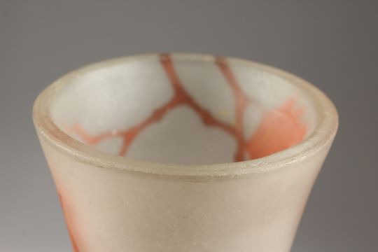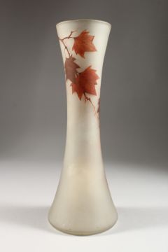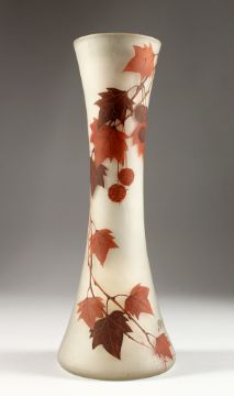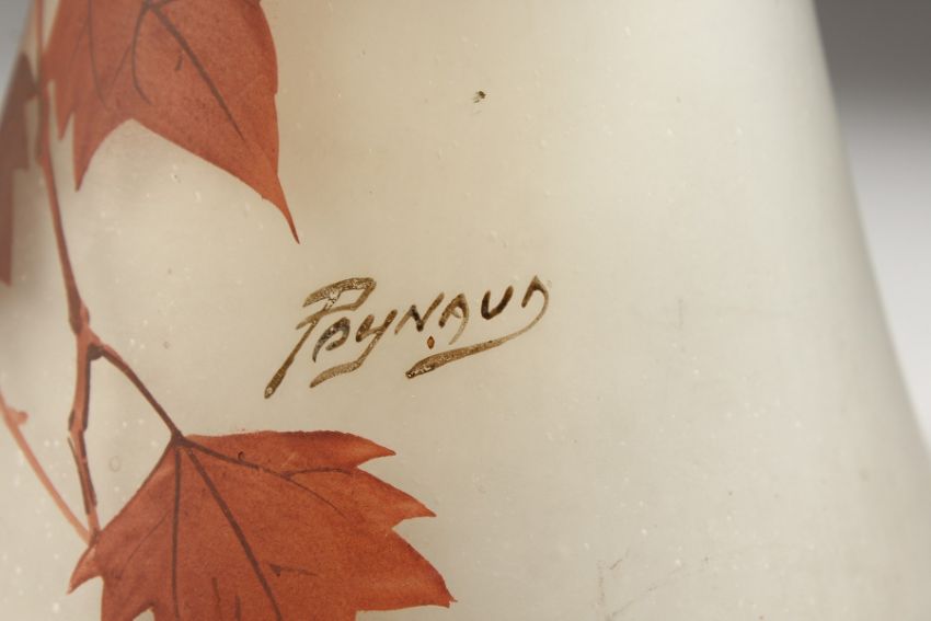 A FRENCH OPAQUE GLASS VASE, with waisted sides, painted in autumnal colours with leaves and berries, signed Paynaud.
