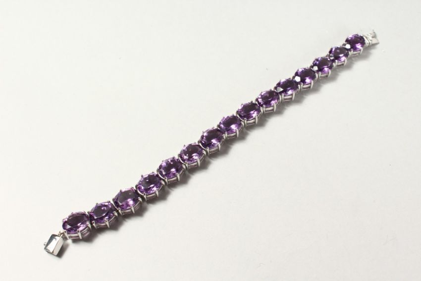A SILVER OVAL CUT FIFTEEN STONE AMETHYST LINE BRACELET.