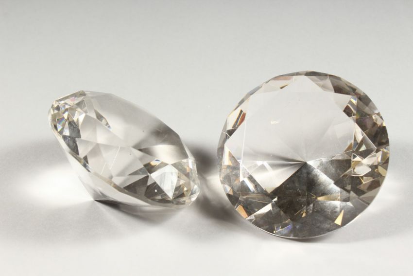 A PAIR OF CRYSTAL DIAMOND-SHAPED PAPERWEIGHTS.