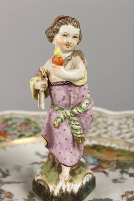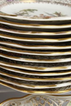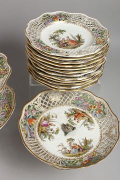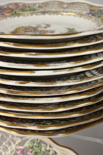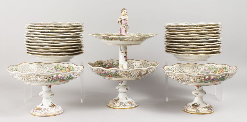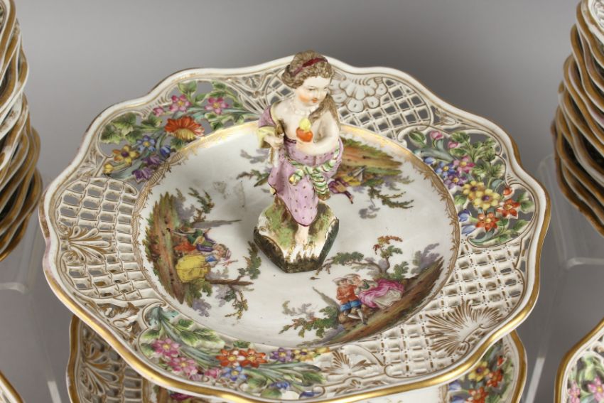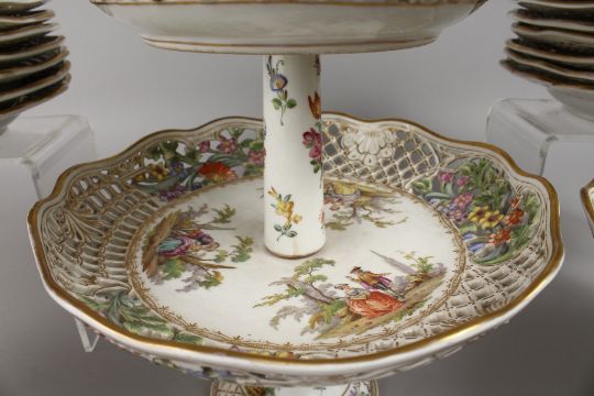 A SUPERB LARGE DRESDEN DESSERT SET, with pierced borders painted with flowers and figures, comprising two tier comport, pair of comports and twenty-four plates.