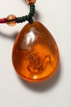 AN AMBER SCORPION PENDANT on a chain.