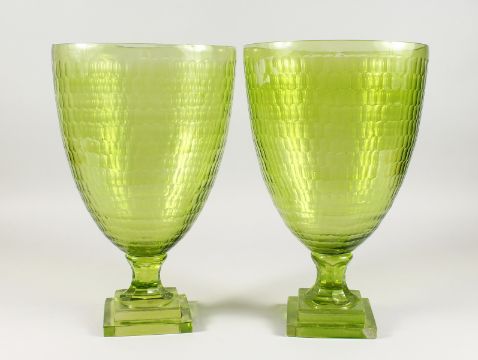 A PAIR OF LARGE GREEN TINTED PEDESTAL VASES on square bases.