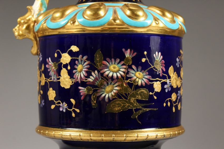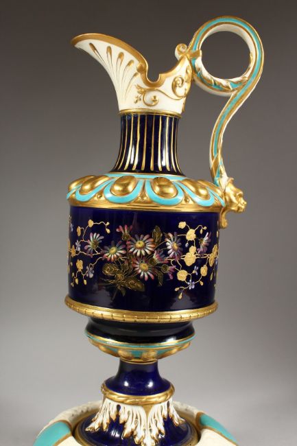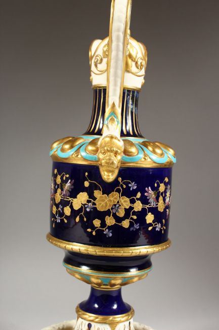 A CONTINENTAL PORCELAIN EWER, dark blue ground with floral and gilt decoration, on a matching stand.