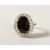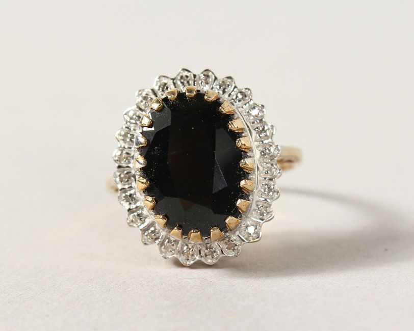 A 9CT GOLD OVAL BLUE STONE AND DIAMOND RING.