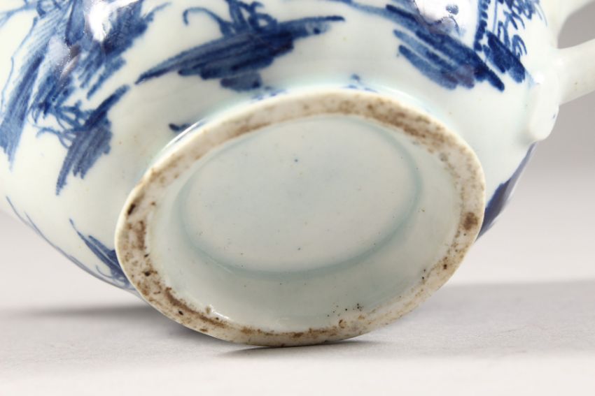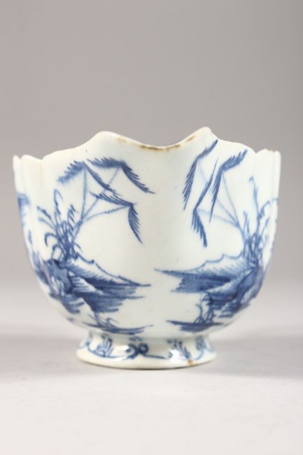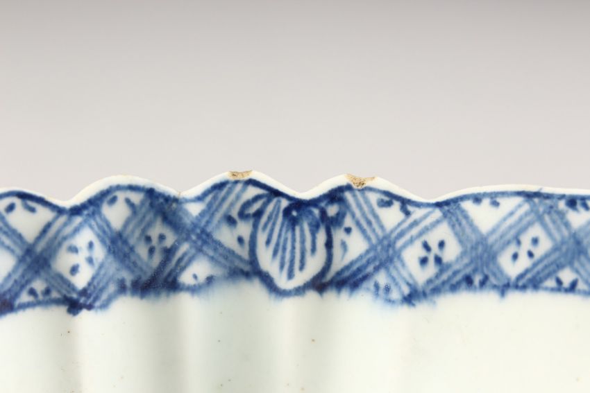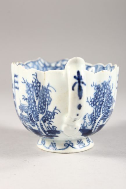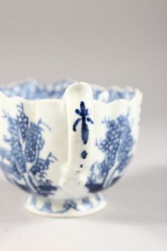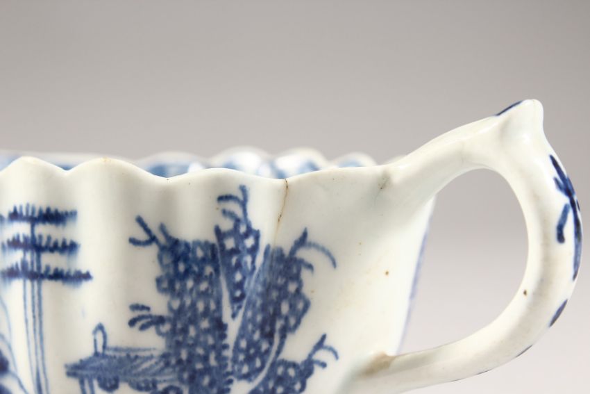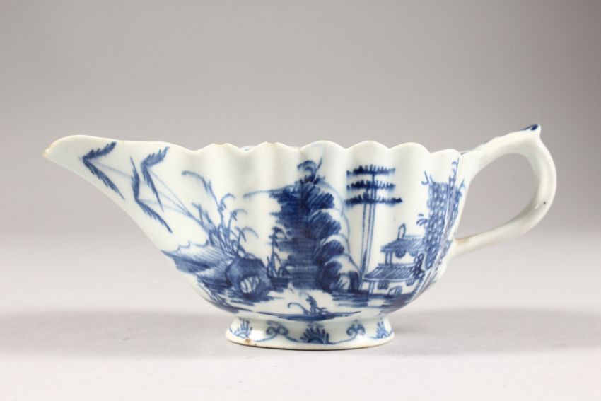 A WORCESTER BLUE AND WHITE RIBBED SAUCEBOAT, Buildings and Trees.