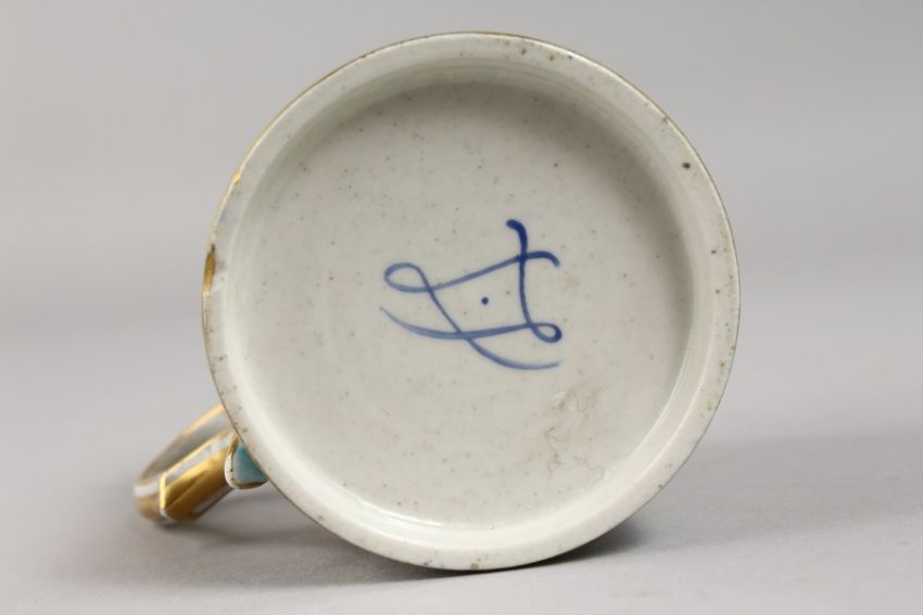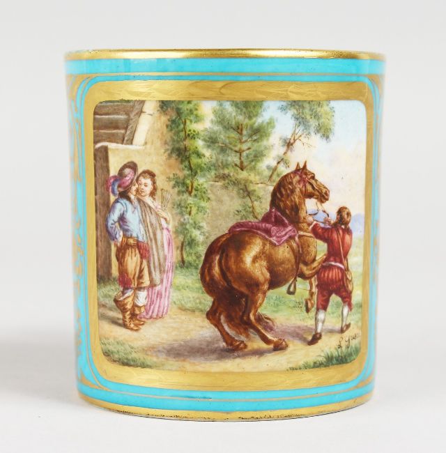 A SMALL LATE 18TH/EARLY 19TH CENTURY SEVRES MUG, painted with three landscape panels.
