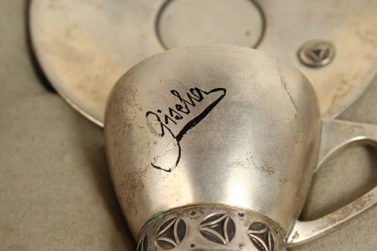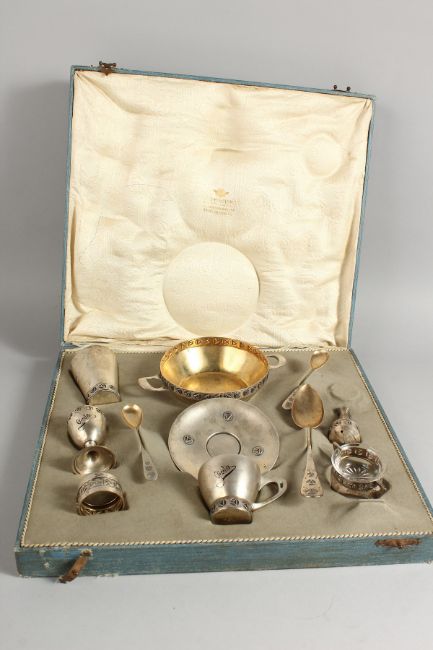 A CZECH .800 SILVER BREAKFAST SET by ED. RIEMER, PRAG, GRABEN 33, CIRCA. 1920-1930, in a fitted case, comprising two-handled bowl, beaker, cup and saucer, egg cup, serviette ring, salt and pepper, teaspoon and two mustard spoons.