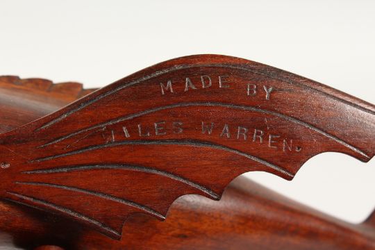 A PITCAIRN ISLAND CARVED WOOD FLYING FISH ON STAND, signed WILES WARREN.