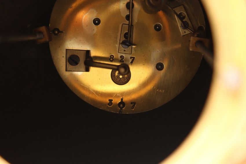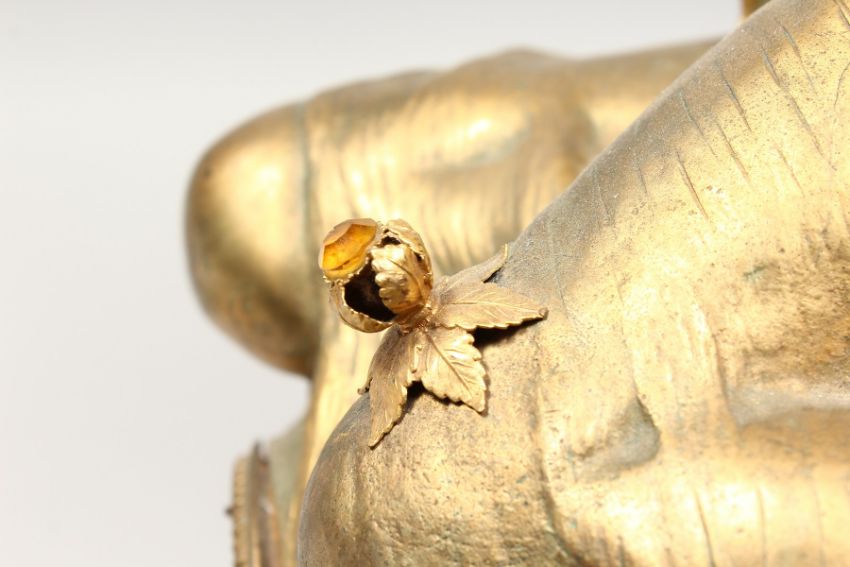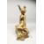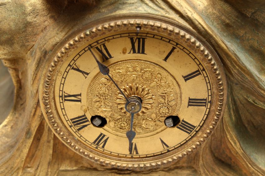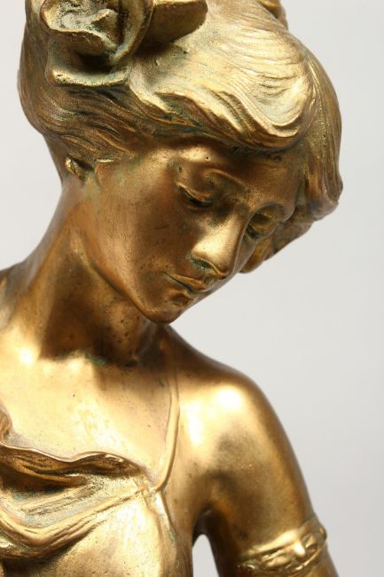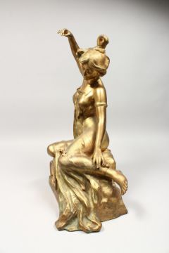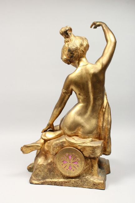 AN ART NOUVEAU GILT SPELTER FIGURAL MANTLE CLOCK, with eight-day movement, the case modelled as a young lady reclining on a rock work base (lacking bell).