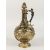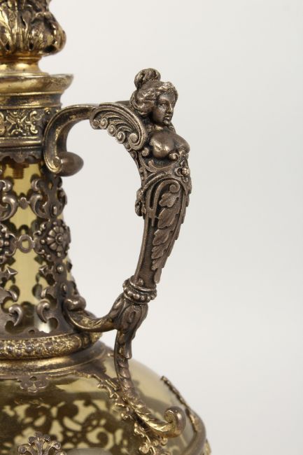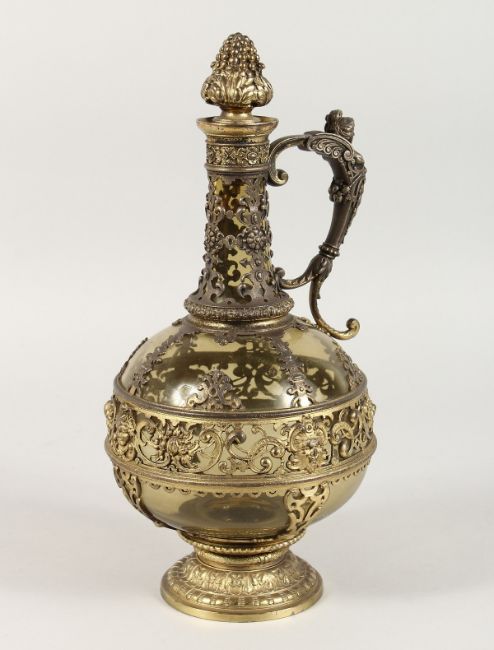 A CONTINENTAL WINE JUG, with green tinted glass body decorative gilt metl mounts and stopper.
