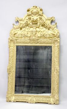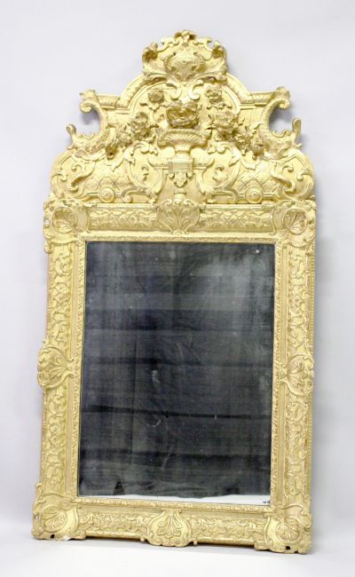 A VERY GOOD 18TH CENTURY GILT FRAME PIER MIRROR, with carved, gesso and gilded frame, the ornate cresting with flowers, dolphins and floral swags, in a black fret decorated frame, with moulded corners.