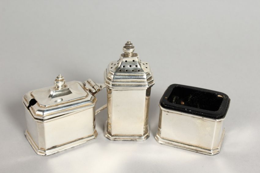 A THREE PIECE SILVER CRUET.