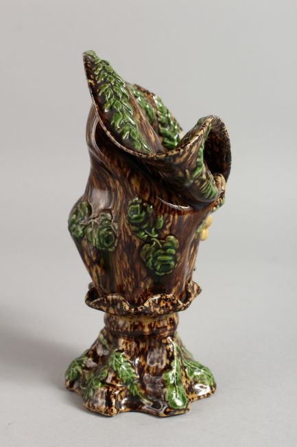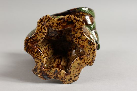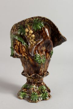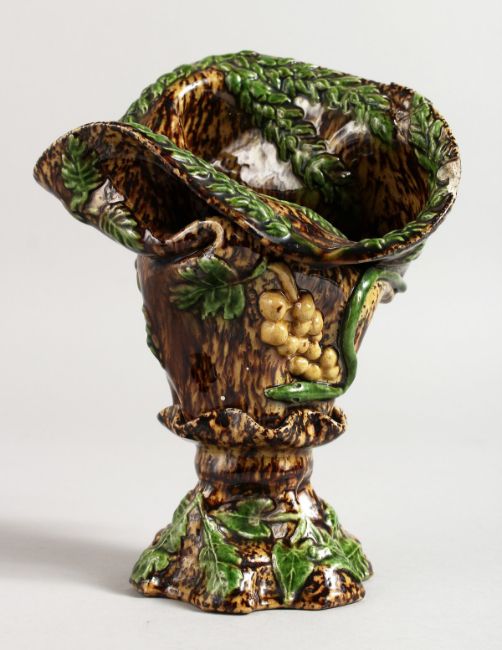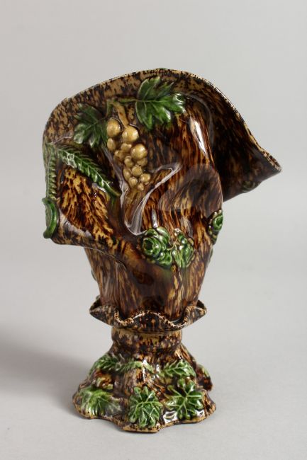 A SMALL MAJOLICA BROWN GLAZED VASE with fruiting vines.