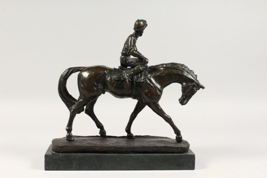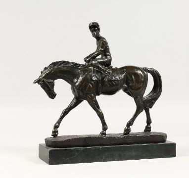 A GOOD BRONZE HORSE AND JOCKEY on a marble base.