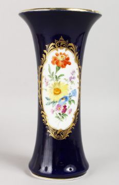 A GOOD 19TH CENTURY MEISSEN RICH BLUE TRUMPET VASE, painted with an oval panel of flowers.