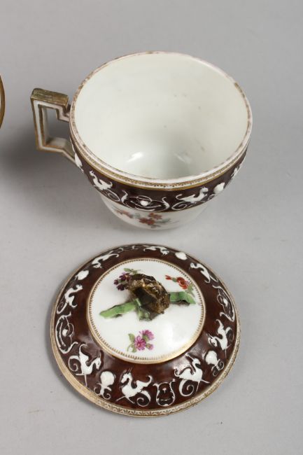 A DRESDEN CUP, COVER AND SAUCER, with a raised border of animals and painted with flowers.
