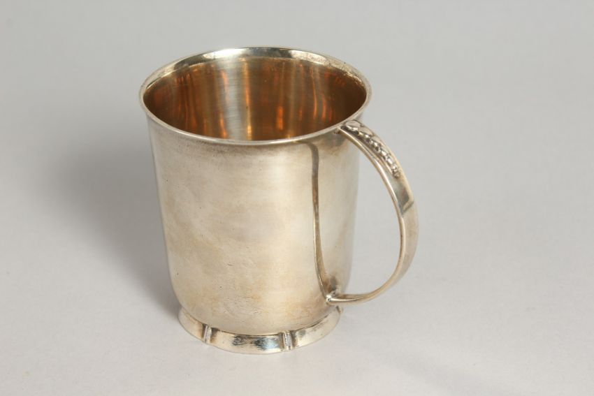 A PLAIN SILVER CHRISTENING MUG with engraved lettering.