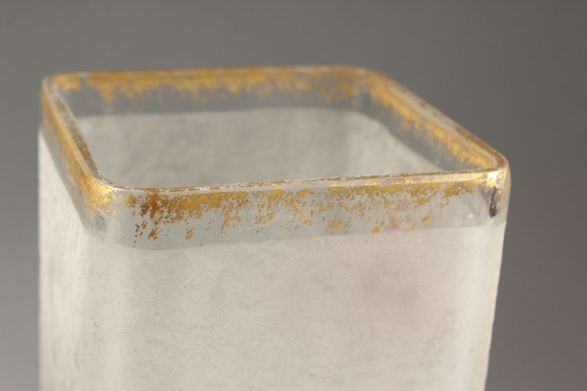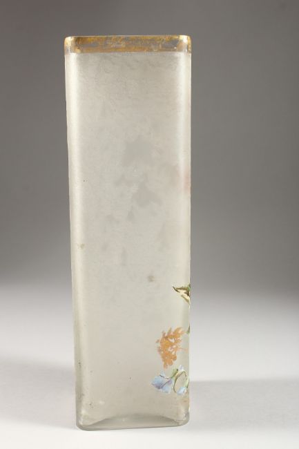 A FRENCH OPAQUE SQUARE SHAPED GLASS VASE painted with flowers.
