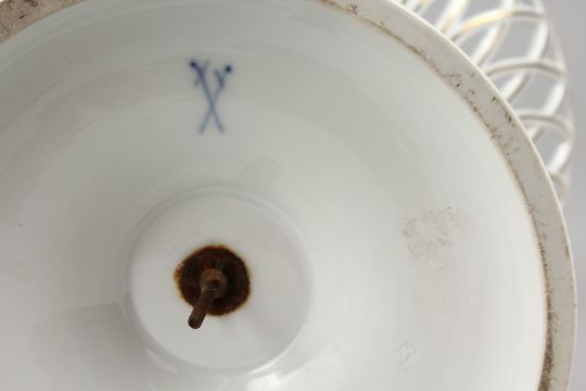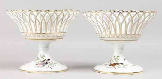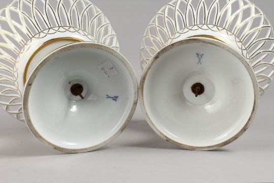A VERY GOOD PAIR OF MEISSEN PIERCED CIRCULAR COMPORTS, 8.75ins diameter, the bases painted with birds and butterflies.