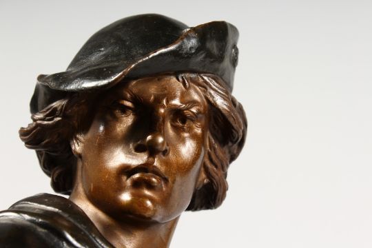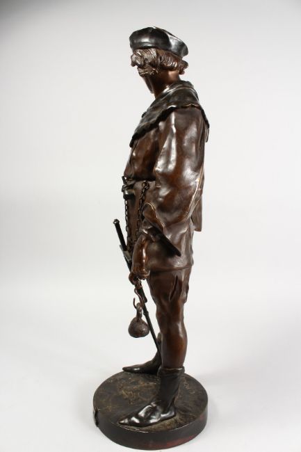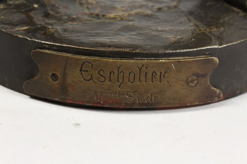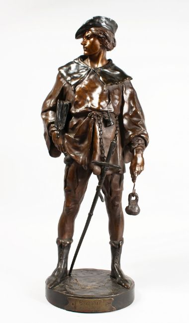"ESCHOLIER" (Perhaps Night Watchman) a young man carrying a weight, a sword in front of him.