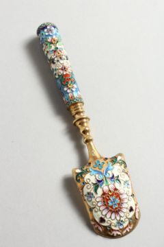 A GOOD RUSSIAN SILVER AND CHAMPLEVE ENAMEL SPOON.