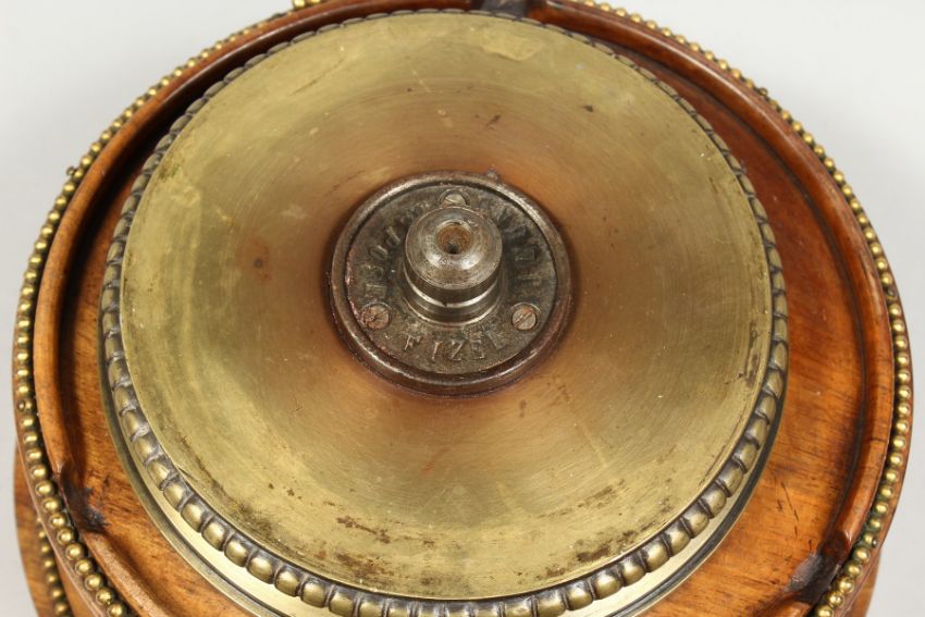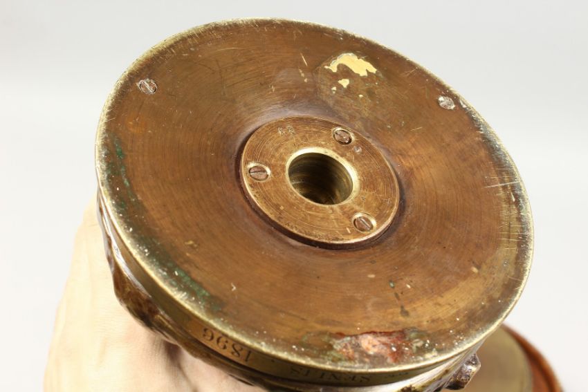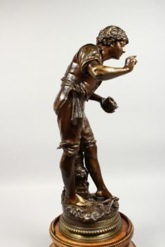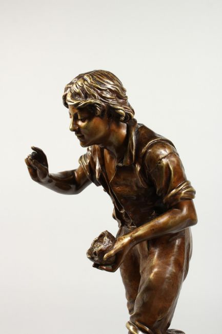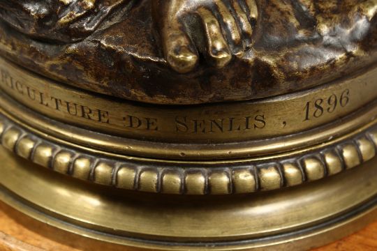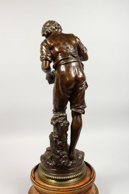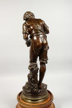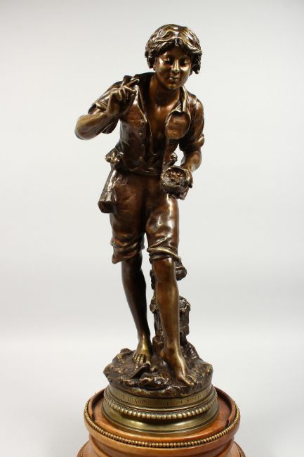 A GOOD 19TH CENTURY BRONZE of a young man, standing by a tree stump, a birds nest in his left hand, the circular base with engraved inscription "Societe D'Agriculture De Senlis, 1896" on a further bronze circular base and turned wood plinth.