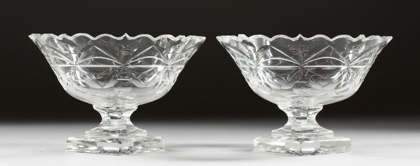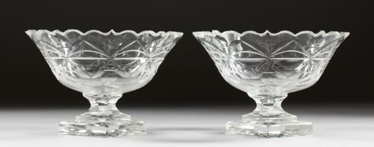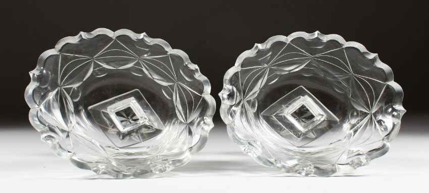 A GOOD PAIR OF CUT GLASS SWEETMEAT DISHES on triangular bases.