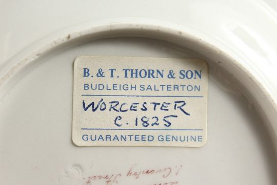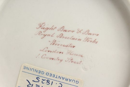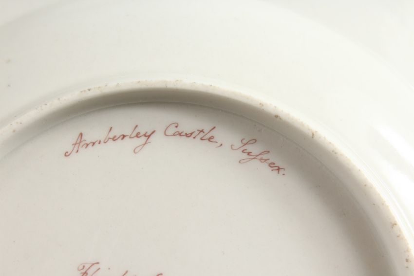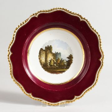 A WORCESTER FLIGHT BARR AND BARR PLATE painted with Amberley Castle, Sussex, on a claret ground, script mark, early 19th Century.