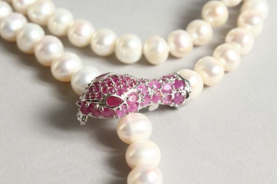 A GOOD SILVER, PEARL AND RUBY SET SNAKE CLASP NECKLACE.