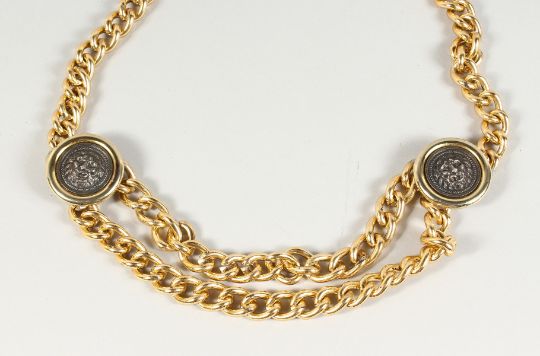 A GILT METAL BELT with two lion masks.