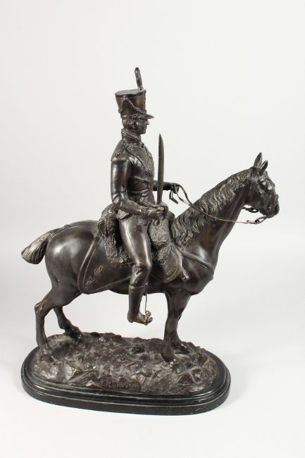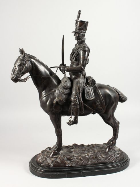 A BRONZE GROUP OF A FRENCH HUSSAR ON HORSEBACK, on a marble base.