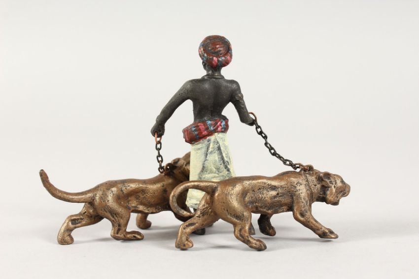 A VIENNA COLD CAST PAINTED BRONZE ARAB WITH TWO LIONS.