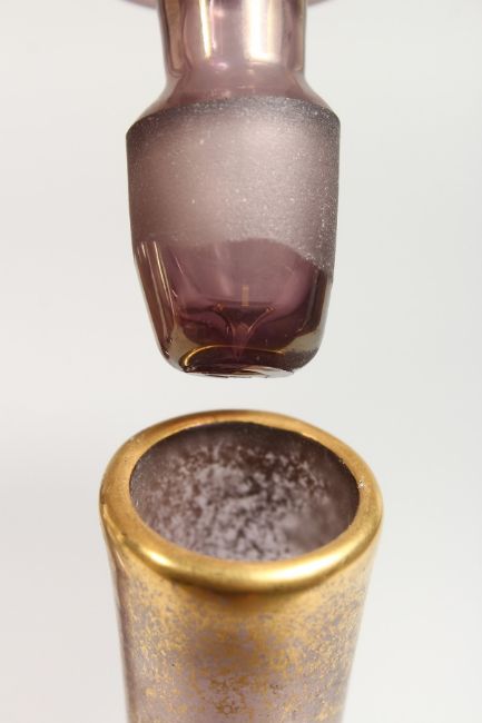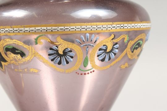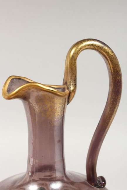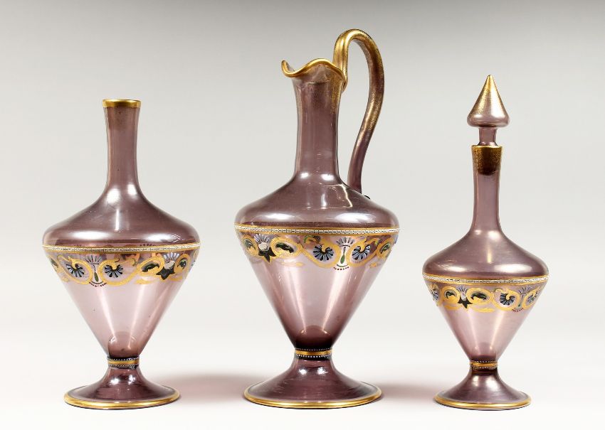 A VENETIAN AMETHYST TINTED GLASS EWER, with gilt and enamel decoration; together with the matching large and small decanter (3).