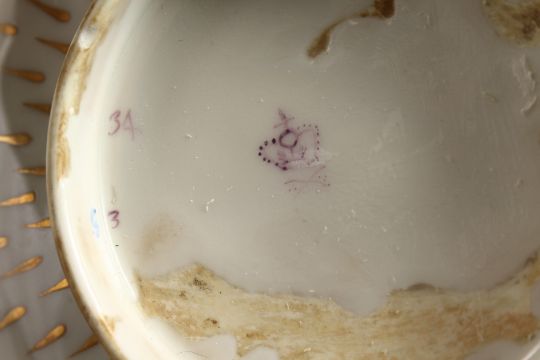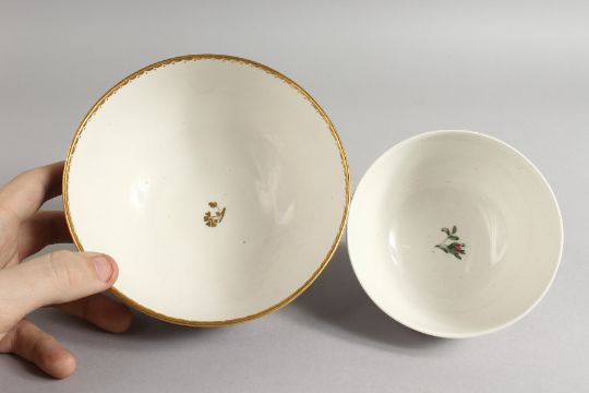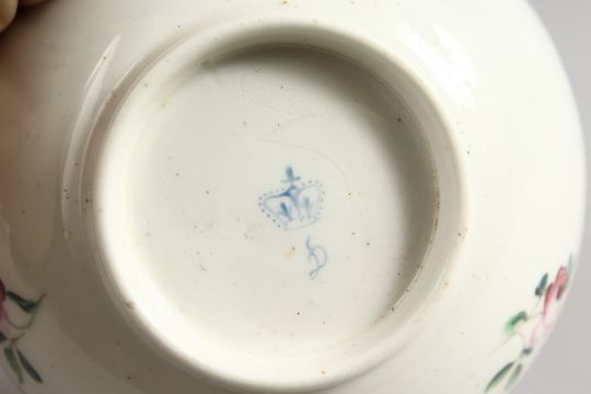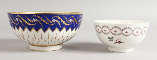 A DERBY BOWL painted with entwined floral swags above three rose sprays, blue and rare incised 'N' and a Derby puce marked bowl with tear drop gliding under a blue and white enamel floral border.