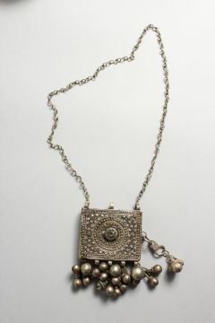 AN ISLAMIC SILVER NECKLACE with rectangular box.