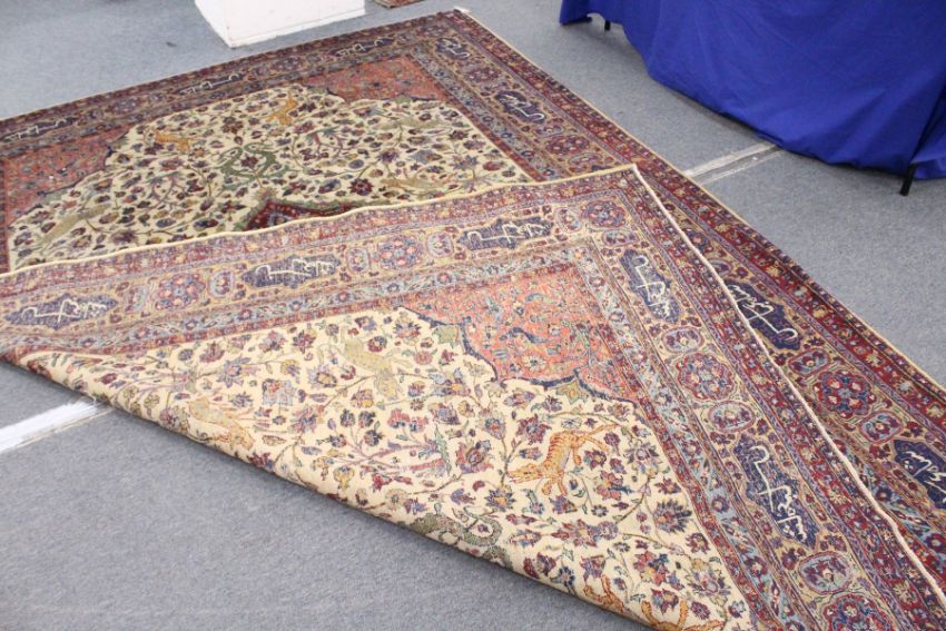 A GOOD PERSIAN CARPET, cream ground with central floral decorated crimson ground panel, the main body of the carpet decorated with animals, dragons, birds, etc., in a border with calligraphy and floral panels.