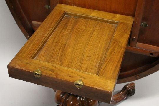 A GOOD VICTORIAN FIGURED WALNUT OVAL LOO TABLE, with quartered top, centre column support, ending in curving quadruple legs and knurly feet with castors.