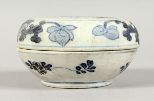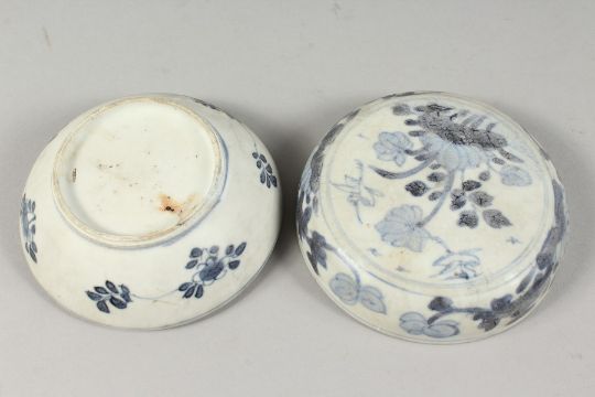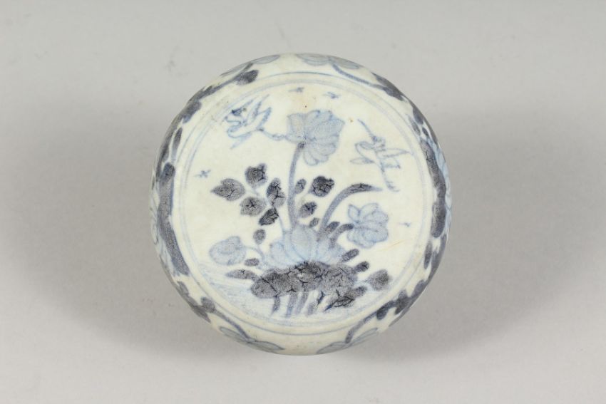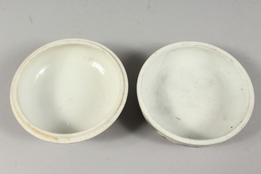 A CHINESE KANGXI PERIOD BLUE & WHITE PORCELAIN BOX & COVER - 9.5CM.