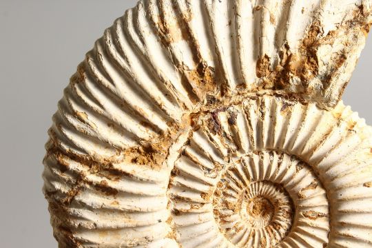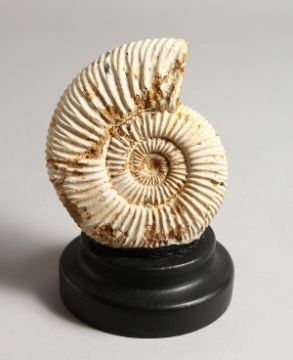 A FOSSILIZED AMMONITE, on an ebonised stand.