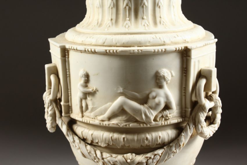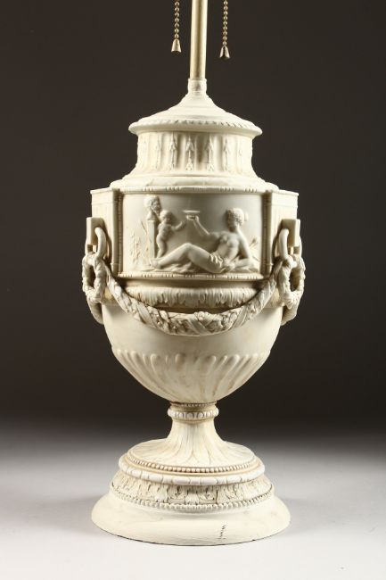 A BISQUE CLASSICAL URN LAMP on a circular base.